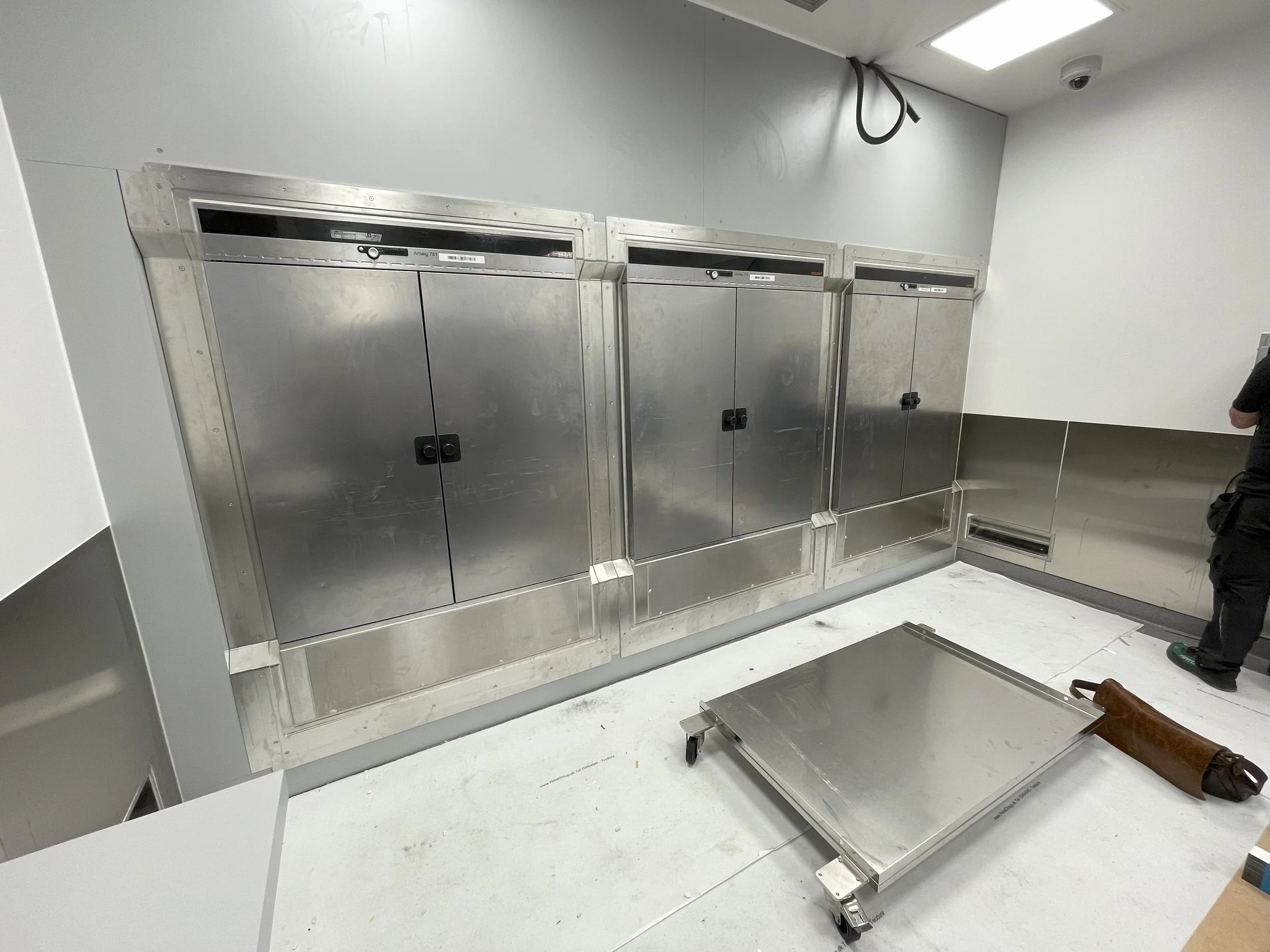 The surrounding cabinet in compact laminate, and a steel frame on the individual heating-cabinets are designed to match each other, and then sealed off with a steel frame, that overlaps the both. On the backside of the overlapping frame there is pharma approved silicone band attached.